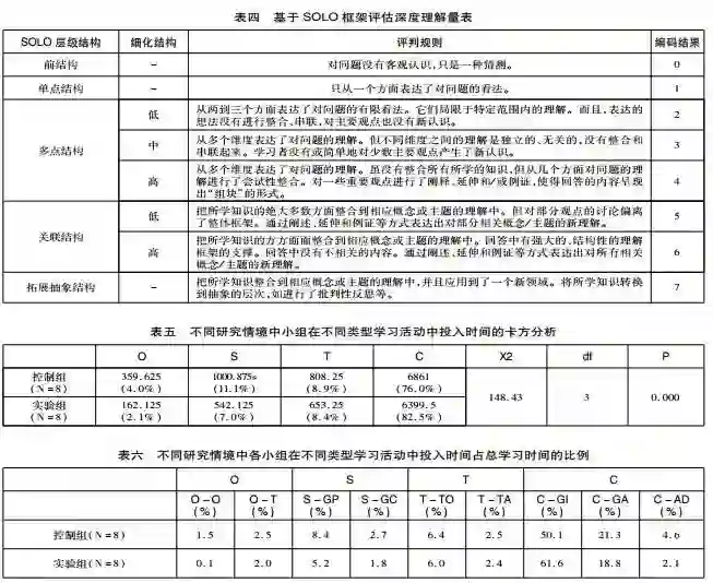 第三,在与学习任务相关的学习活动(T)中,实验组投入时间占总学习时间的8.9%,控制组投入时间占总学习时间的8.4%。这说明,在两种学习情境中,小组在讨论需要解决什么问题和问题解决的策略等方面消耗了同等比率的学习时间。