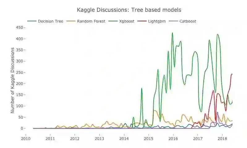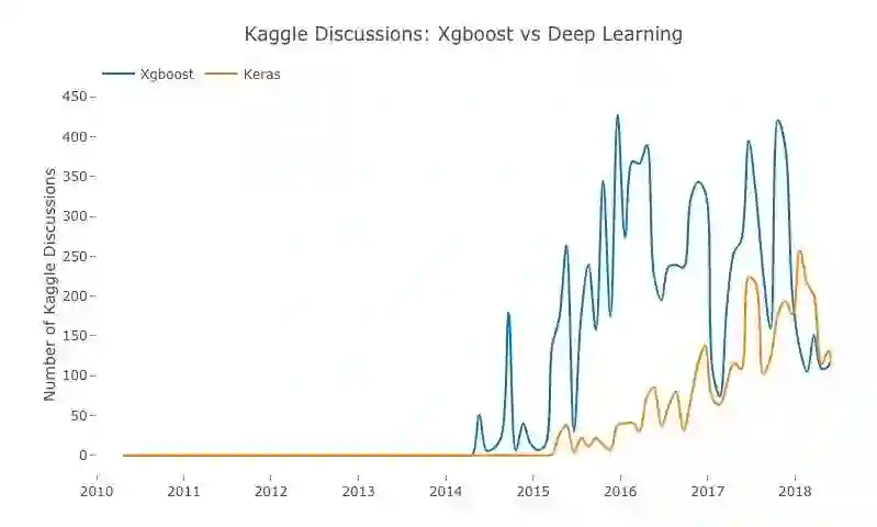 在2014年以前,线性模型、决策树和随机森林的讨论量虽然不多,但它们占据绝对话语权。2014年,时为华盛顿大学博士的陈天奇开源XgBoost算法,受到大众追捧,之后它也迅速成了Kaggle竞赛中的常客。时至今日,XgBoost在竞赛中的使用率还是很高,性能也很好,不少夺冠方案中都有它的身影。
