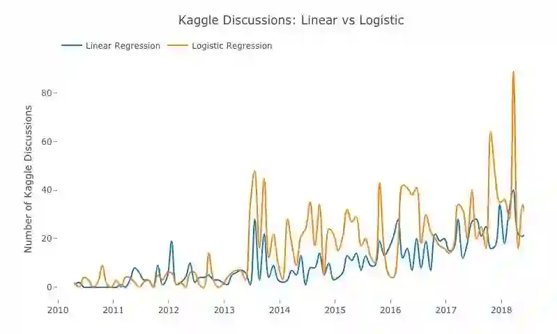 线性回归与逻辑回归是机器学习中比较基础又很常用的内容,其中前者可以进行连续值预测,后者能被用于解决分类问题。所以我们先从它们开始,根据Kaggle论坛的帖子数对比这两种算法的热度趋势。