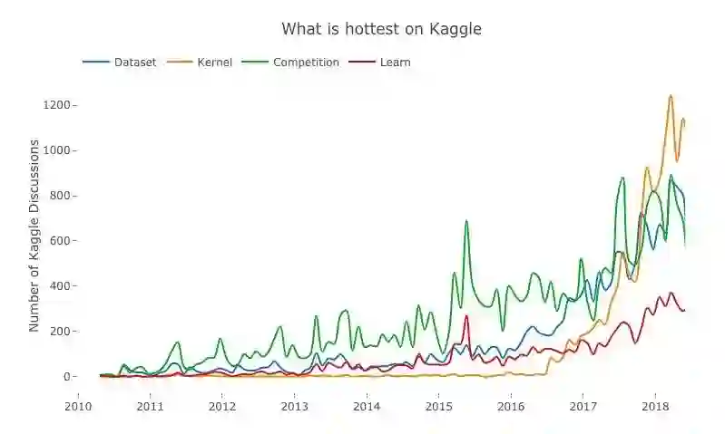 既然Kaggle是个数据科学竞赛平台,用户们讨论的内容自然是参加什么竞赛,用了什么数据集,并分享看到的实用代码。而根据上图的曲线,自从2016年推出后,代码Kernel的受欢迎度一路飙升,毕竟用户们可以在上面看到其他参赛者自愿公开的模型代码,这对于学习和交流来说是不可多得的优质资源。