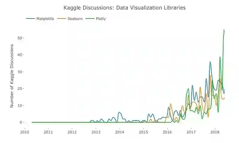 从2017年起,Plotly就像开了挂一样一路走红,现在已经成为Kaggle用户最常用的可视化工具。排名第二的是Seaborn,它实际上是在Matplotlib的基础上进行了更高级的API封装,生成的图更好看,而作为补充,Matplotlib的图更有特色。