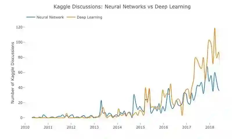从2014年起,我们相继迎来了theano、tensorflow、keras,与此同时,一个名为深度学习的时代也渐渐出现在世人视野里。在Kaggle上,用户发表的有关深度学习的帖子数不断上升,并最终超过神经网络。此外,诸如亚马逊、谷歌等的云服务提供商也正拥抱新技术,以更加积极的姿态展示在云上训练深层神经网络的能力。