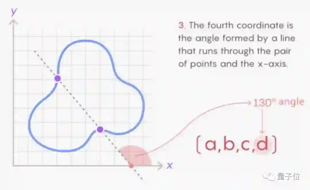 最后,将穿过两个原始点的直线与x轴正方向的夹角作为第四个坐标。