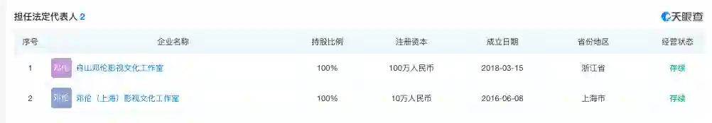 天眼查APP显示,邓伦名下只有舟山邓伦影视文化工作室和邓伦(上海)影视文化工作室两家公司,均为邓伦本人100%持股,为邓伦个人独资企业。