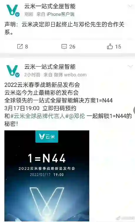 3月15日,云米微博发文称即日起解除与邓伦的合作关系。而就在今日,云米官方微博还@邓伦,官宣其为全球品牌代言人。目前,该官微已删除邓伦相关互动。