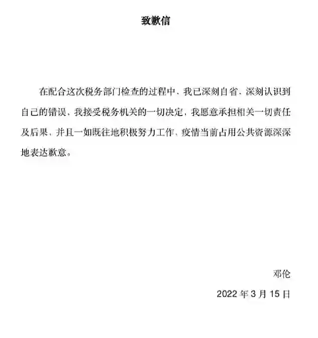 随后“邓伦偷逃税款被追缴并罚款1.06亿元”的话题登上微博热搜榜。下午4时许,邓伦通过微博回应此事,表示“已深刻反省,深刻认识到自己的错误,愿意承担相关一切责任及后果。”