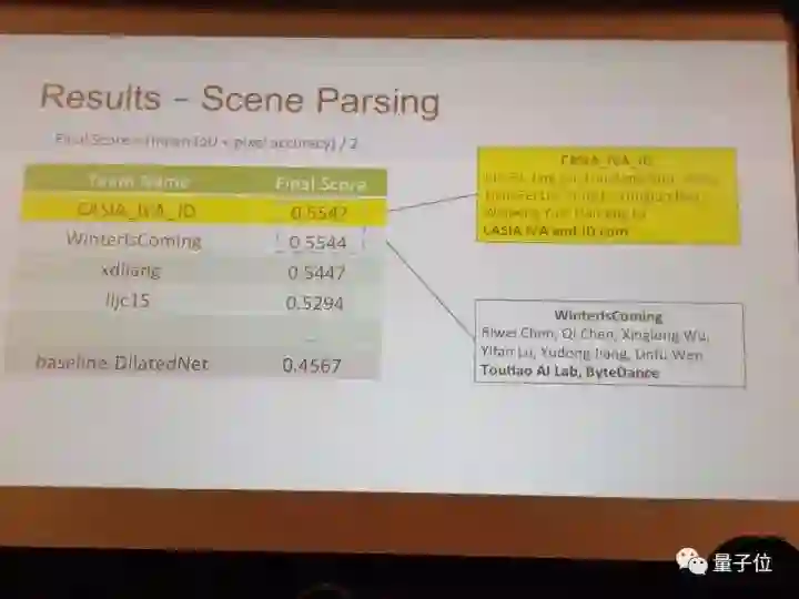 Places场景分割挑战赛的冠军由中科院自动化所和京东联合建立的CASIA_IVA_JD队拿下,第二名是今日头条的WinterIsComing队。