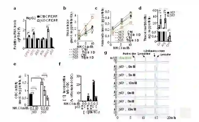 图1. (a,b),p53调控尿素循环代谢酶基因表达(a),和尿素释放(b)。(c-g),p53通过尿素循环调控了氨的生成(c),肿瘤生成(d),细胞内ODC的酶活性(e),ODC蛋白翻译(f)和多胺合成(g)。