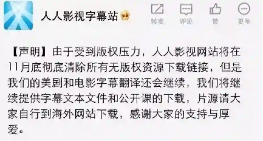 A、B两站已“阵亡”,免费网盘、无偿字幕组和海外影视直播平台也是唇亡齿寒,曾经的教训还摆在眼前:去年6月1日起被关停整改的微盘直到现在也没恢复使用。习惯于在网上搜索免费资源的小伙伴们这回瑟瑟发抖,感受到来自国家监管的暴击。
