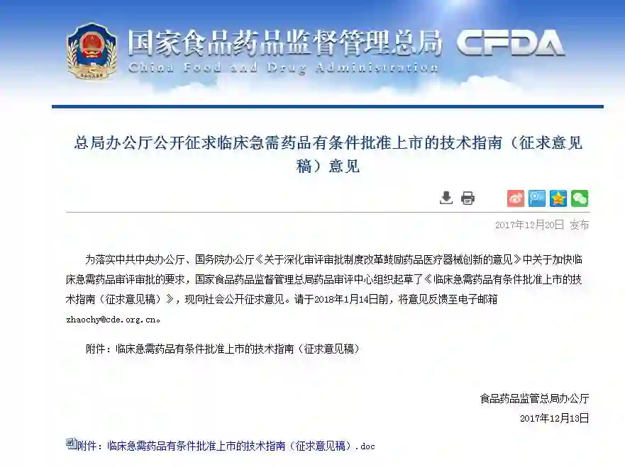 12月20日,CFDA官网发布《临床急需药品有条件批准上市的技术指南(征求意见稿)》。根据意见稿,临床急需药品有条件批准上市是指对用于治疗严重危及生命且尚无有效治疗手段的疾病的创新药,在规定申请人必须履行特定获得正规批准的条件下,基于以下情况而批准上市。