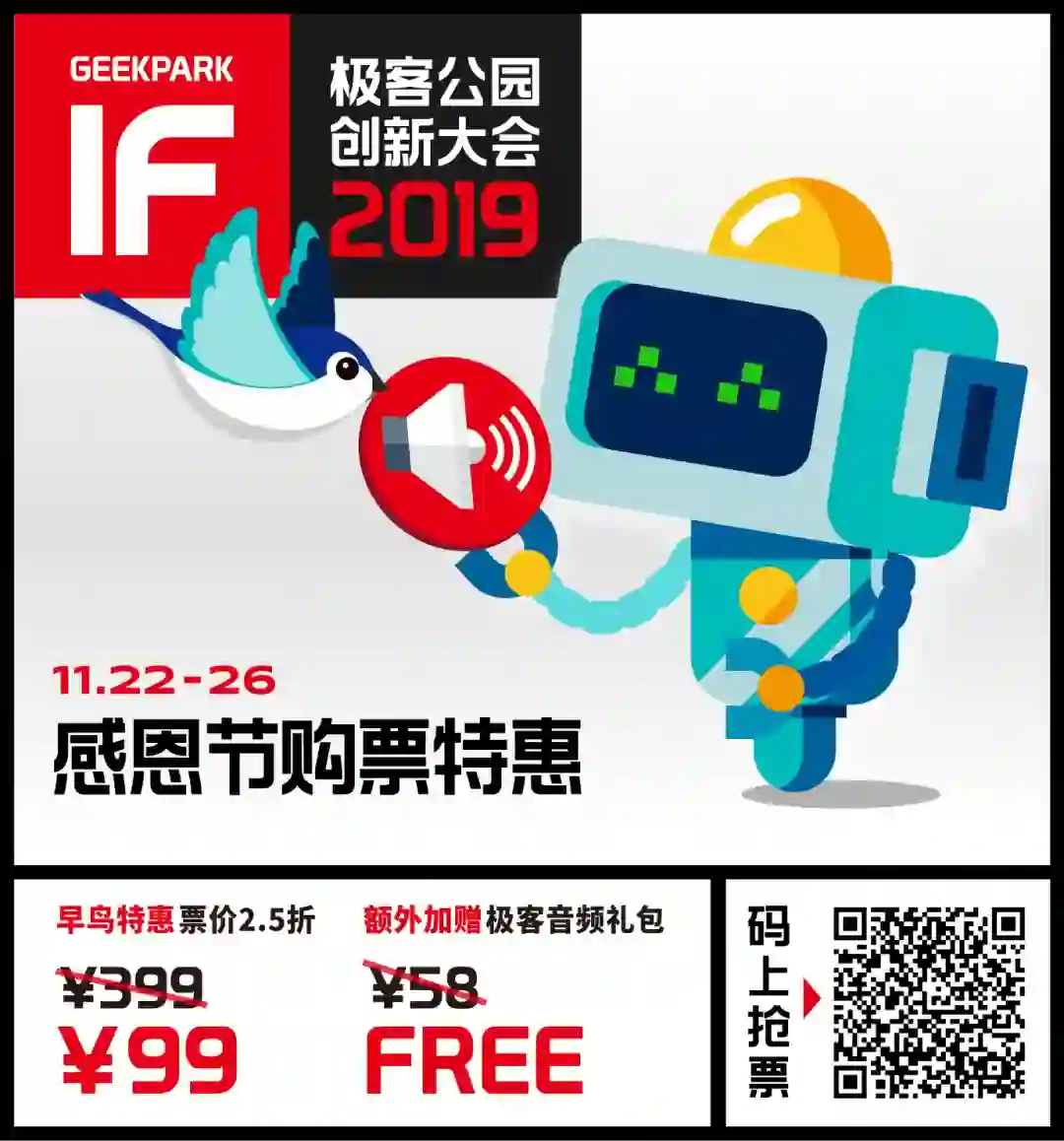 IF19 早鸟票购票通道现已开启,感恩节期间购买前 100 名再送极客音频礼包,立即扫描下方二维码或点击「阅读原文」参与限时抢购。