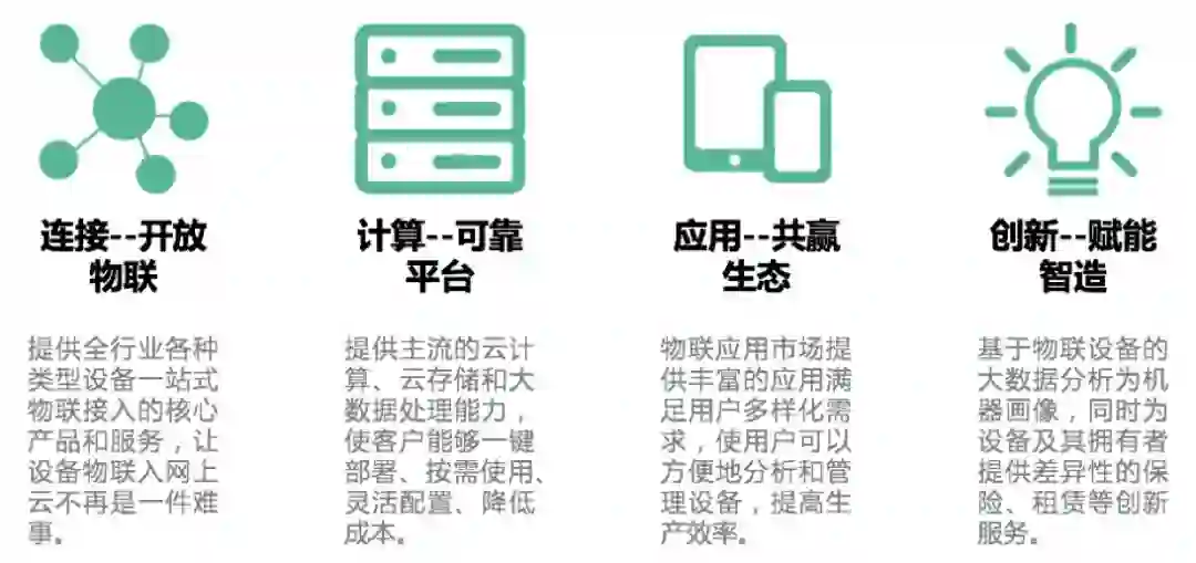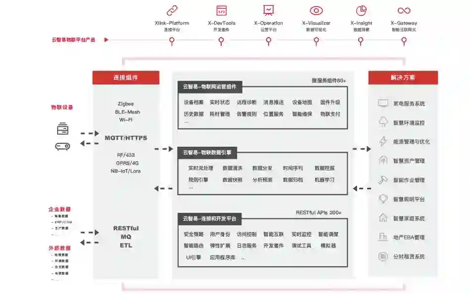 云智易物联云平台面向IoT硬件厂商,以让传统企业拥有物联网的力量为使命,以交付开箱即用的物联运营平台为目标,将平台能力作为服务,打包成软件或以SDK的形式提供给传统企业,协助传统厂商的产品快速向智能化和服务化转型。让传统企业实现以客户为核心,以设备为纽带,实现强连接和强运营。围绕目标,云智易产品分为4个子平台、80多个服务组件,涵盖物联网设备连接、设备管理、开发平台、数据和用户运营。