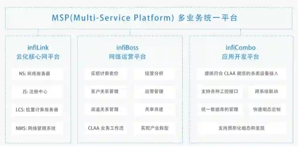 MSP(Multi-Service Platform)多业务统一平台:包括infiLink云化核心网平台、infiBoss网络运营平台、 infiCombo应用开发平台三大核心平台。