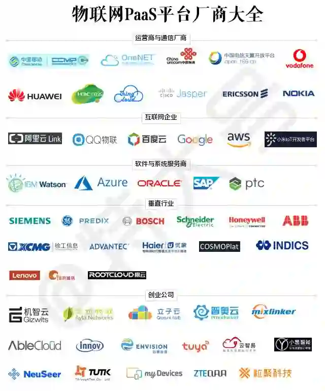 本文按照4大领域的玩家的分类方法逐一介绍PaaS物联网平台,其中包含通信领域、互联网领域、软件系统服务领域、垂直领域。其中,通信领域包括以移动、联通、电信、华为、新华三为代表的电信运营商和电信设备商;互联网领域包括阿里、腾讯、百度、小米等;软件系统服务领域包括IBM、微软、PTC等;垂直领域主要分为两个部分,包括以三一重工、GE、西门子等为代表的工业类企业,以基本立子、普奥云、机智云、涂鸦智能、寄云等为代表的创业企业。