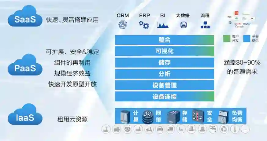 传统IT企业、通信运营商、通信设备商、互联网企业、工业方案提供商、新型创业公司等多股势力如雨后春笋般纷纷涌入,在经过井喷期的热闹,平台沉淀进入下半场盘整,物联网平台基于IaaS、PaaS、SaaS三种云计算服务模型,逐步完善了其功能体系,即ICP(基础设施云服务平台)、CMP(连接管理)、DMP(设备管理平台)、AEP(应用使能平台)、BAP(业务分析平台)等。
