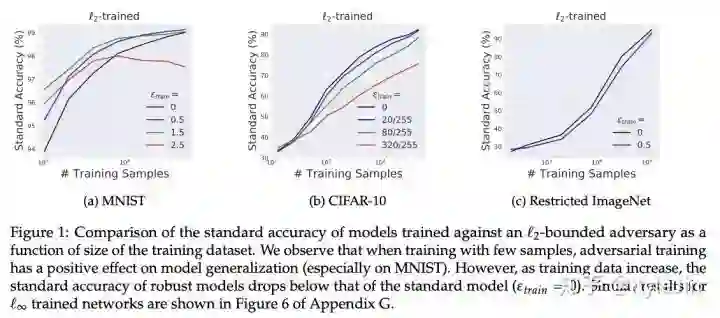 首先,经验上来说,在训练数据不足的时候,加入robustness(例如,对抗样本训练)会对模型的泛化起到积极的作用。但是,当数据量变大/变得复杂,这个效果就消失了(哪怕是在稍微复杂一丢丢的数据集,例如CIFAR10,CIFAR100上,这个效果就从未体现出来)。这是好理解的,在简单/小数据上,过拟合/欠鲁棒发生了,但是程度可能非常有限。