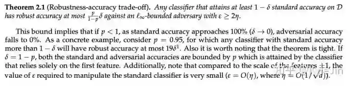 在权衡的另一端,鲁棒性的一个很强的例子是对对抗样本鲁棒(adversarial robustness),是一个非常强的约束,从而会导致test accuracy大幅下降。这体现了过鲁棒-无法泛化,在刚才提到的paper里也有论证这一点。
