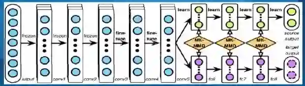 [Deep Adaptation Networks (DAN) Long et al. 2015] 这个论文展示了一个fully-shared的TL模型,也是最常用的一种TL模型,基本idea是用一个NN学一个shared representation,然后对于源领域和目标领域各自训练一个分类器来学习各自的label。他们还提出了一个MK-MMD来学习最后一层的domain difference。整体结构如下:
