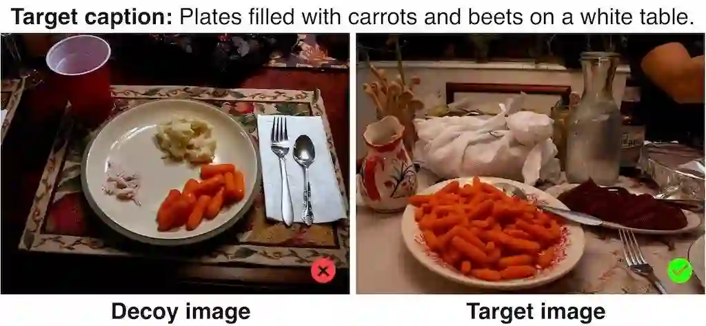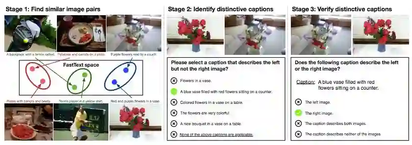 图 2:COCO-BISON 数据集收集过程图示:研究者使用 COCO captions 数据集进行 BISON 数据集收集工作。首先利用描述相似度寻找相似图像,然后标注者选择对图像对中其中一个图像的描述,最后研究者让多个标注者分别基于描述选择正确的图像,从而验证标注的准确性。