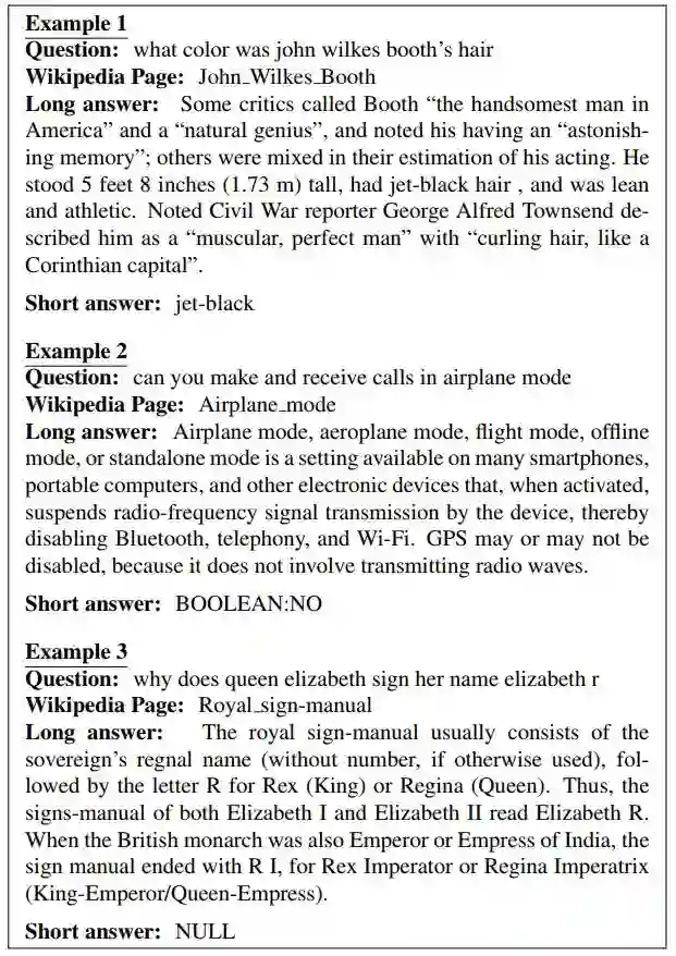 NQ 数据集的论文中展示了标注的过程与结果。简而言之,谷歌的标注过程可以分为以下几个步骤:向标注者呈现问题和维基百科页面;标注者返回一个长回答与短回答。其中长回答(I)可以为维基百科页面上的 HTML 边界框,一般可以是一段话或一张表,它包含回答这些问题的答案。当然,如果没有合适的答案或者答案太分散,标注者也可以返回 I=NULL。短回答(s)可以是 I 中的一个或一组实体,它们可回答问题。如下展示了数据集的样本示例: