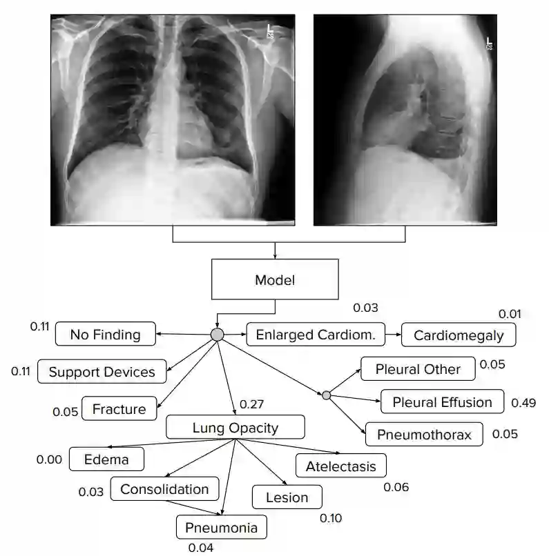图 1:CheXpert 任务旨在根据多视角胸部放射影像预测不同观察结果的概率。
