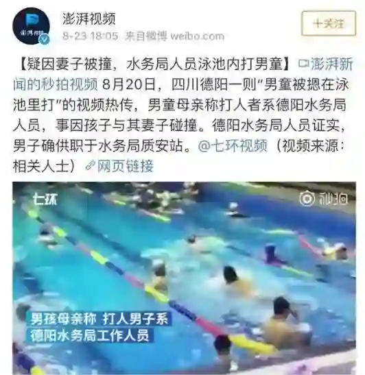 更过分的是,还把精心剪辑好的视频发到网上,掩盖事实真相,并配上误导性文字,“疑因妻子被撞,水务局人员泳池内打男童”,引发众人围观。