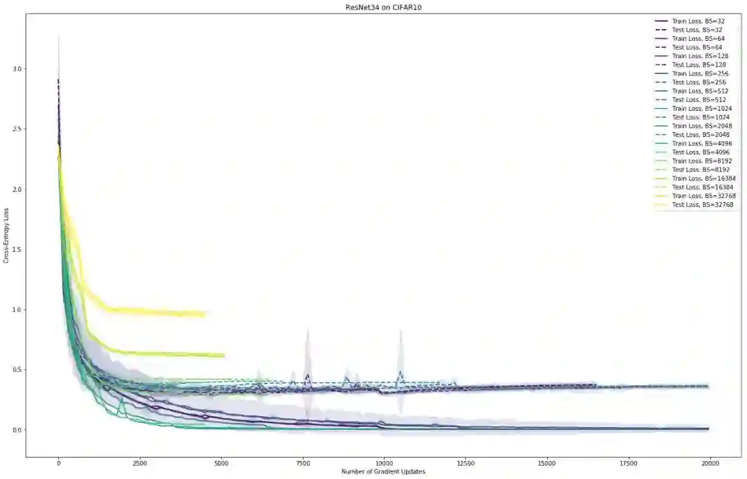 由于我们在将 n(x) 加到梯度之前,按照 1/√m 的因子将其进行缩放,因此增加了批处理的规模,降低了小批量估计的整体方差。这是一个值得解决的问题,因为大的批量尺寸可以使模型训练得更快。它在两个重要的方面使得训练更快:训练误差在更少的梯度更新中易于收敛,并且大的批量尺寸使得我们能利用大规模数据并行的优势。但是,不使用任何技巧就增大批量尺寸会导致测试误差增大。这个现象被称为泛化能力下降(generalization gap),并且目前还存在一些为什么会出现这种情况的假说。一个流行的解释是,我们的「探索性噪声」不再有足够的力量将我们推出一个尖锐最小值的吸引域。一种解决办法是简单地提高学习率,以增加这种噪声的贡献。这种缩放规则非常成功(https://arxiv.org/abs/1706.02677)。