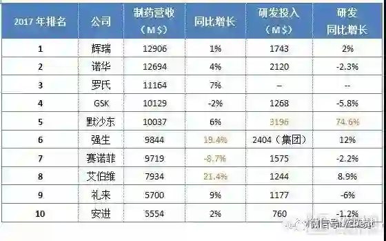 根据外药企2017年财报的营收数据显示,排名前十的药企分别是辉瑞、诺华、罗氏、葛兰素史克(GSK)、默沙东、强生、赛诺菲、艾伯维、礼来、安进。