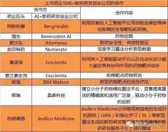 比如,阿斯利康与BergHealth,强生与Benevolent AI,默沙东与Atomwise,武田制药与Numerate,赛诺菲和葛兰素史克与Exscientia,辉瑞与IBM Watson ,辉瑞与晶泰科技等都打成了合作关系。动脉网对这些合作进行了盘点,了解他们的合作内容。