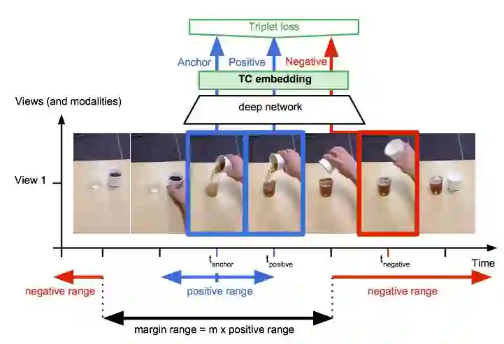 图4,时间对比网络,Time-Contrastive Networks (TCN)在嵌入空间中,从相同时间点上不同视角获得的Anchor 和正图像之间的距离会更近,同时,它们与从相同序列但是时间点上不同的负图像之间的距离要远一些。这会迫使模型去捕获哪些随着时间变化但是在视角上有连贯性的属性,比如手势。同时,这也能保证,在背景或者关系变化时,模型能保持稳定。