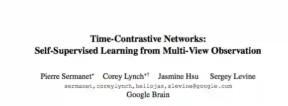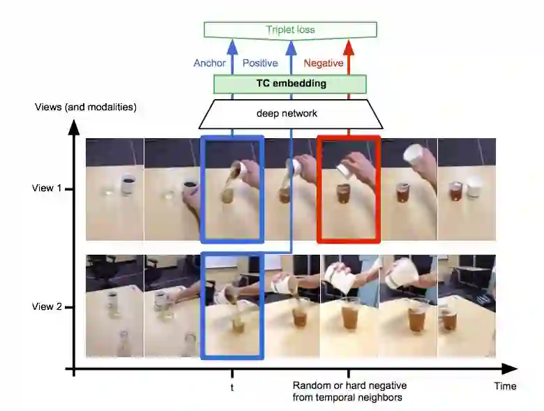 我们提出了一种用自我监督来学习表征的方法,可以完全从多个视点记录的未标注视频中进行学习。这一研究与机器人模仿学习尤其相关,机器人模仿学习要求系统对人与自然环境之间的关系有所理解(视角不变),包括对象交互、属性以及身体姿态。我们使用 triplet loss 来训练表征,其中同一个观测的多个同时视角被吸引在嵌入空间中,同时被从视觉上相似但功能上不同的时间相邻者排斥。这一信号鼓励我们的模型去发现不随视角变化而随时间变化的属性,同时忽略掉如遮挡、运动模糊、光和背景这样的有干扰性的变量。