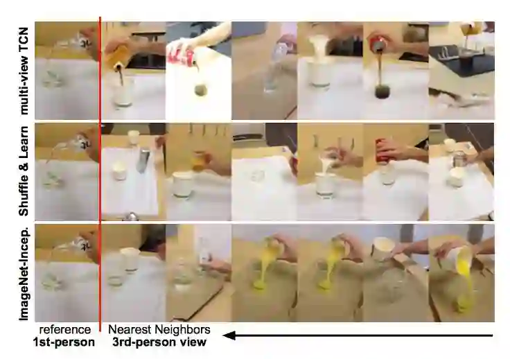 但是要想成功地实现“模仿”,机器人必须要弄清楚自己的行为是否与人类展示的行为一致,尽管机器人和人类之间的视角(viewpoint)有很大的不同。比如,在倒饮料这一任务中,机器人必须要理解的概念包括,手与容器的接触,容器的倾斜角度,以及容器内是否有液体在流动。
