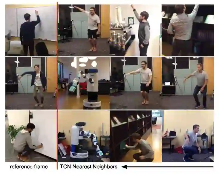 我们的实验表明,这样的表征甚至要求对象实例某种程度上的不变性。研究表明我们的模型可以正确地识别复杂对象交互中的相应步骤,例如在带有不同实例的不同视频之间倒水。 据我们所知,我们的研究首次显示了真实机器人对人类运动进行端对端模拟学习的自我监督的结果。
