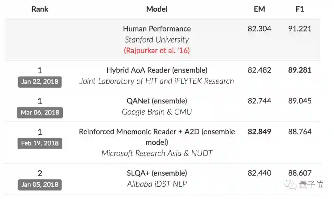 目前SQuAD有三个并列第一,除了哈工大讯飞联合实验室团队、微软亚洲研究院和国防科大联合团队之外,还有一个新面孔挤了进来:Google Brain和CMU联合团队。