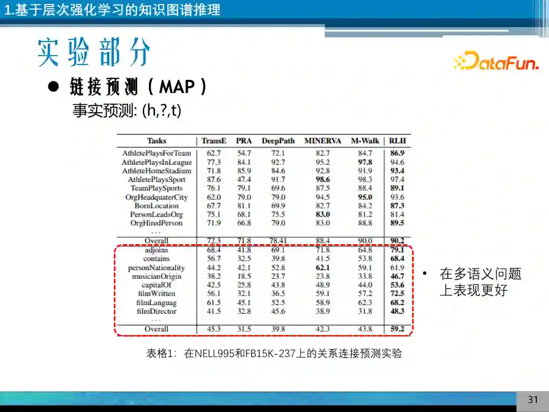 使用的评价指标是平均准确率、平均排序分数和 Hit@X。数据集是常识知识图谱 FB15K、NELL995、WN18RR,其中 FB15K 的多语义现象比较严重。