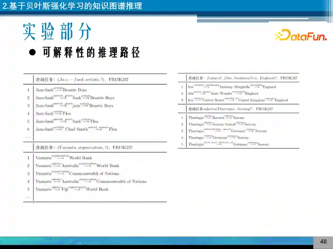 第二个是事实预测的实验,给定两个实体,预测它们之间是否存在某种关系,是一个二分类的问题,模型在 FB15K-237 上表现更好一些。