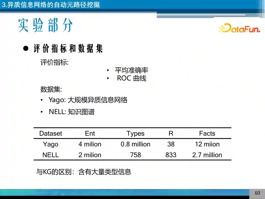 实验部分采用挖掘得到的元路径进行链接预测。采用的数据集是 Yago 和 NELL,即大规模异质信息网络或知识图谱。Yago 和 NELL 具有上百万的实体,Yago 中具有 80 多万个类型;NELL 具有 700 多个类型。与 KG 的区别是具有大量的类型信息。