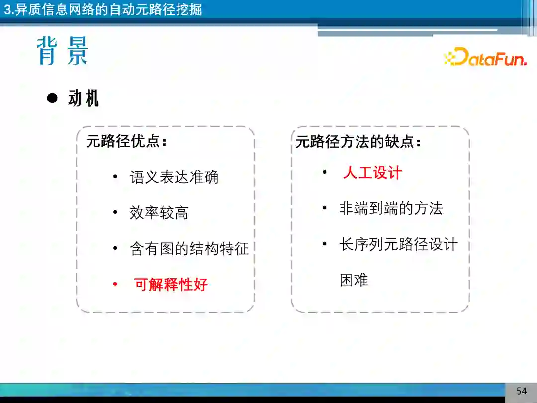 元路径优点是,语义表达准确,效率较高,含有图的结构特征,可解释性好。缺点是,需要人工设计,人工构造 Meta Path,是非端到端的方法,对于长序列元路径设计比较困难。