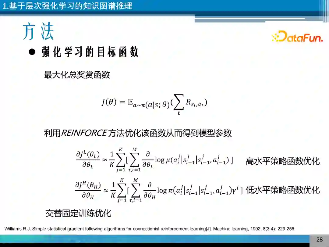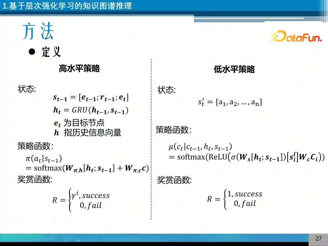 具体实现分层强化学习的方法是设计两个互相嵌套的强化学习,一个是高层次的策略函数,一个是低层次策略函数。高层次策略控制知识图谱实体间的状态转移,低层次策略控制语义簇之间的转移,语义簇是用 TransE 的嵌入来构建。
