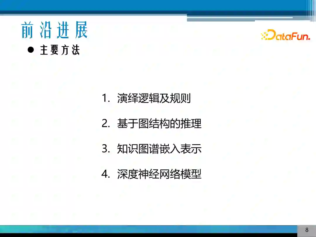 这里将前沿进展的主要方法分为 4 个部分,一是演绎逻辑及规则;二是基于图结构的推理;三是知识图谱嵌入表示;四是深度神经网络模型。