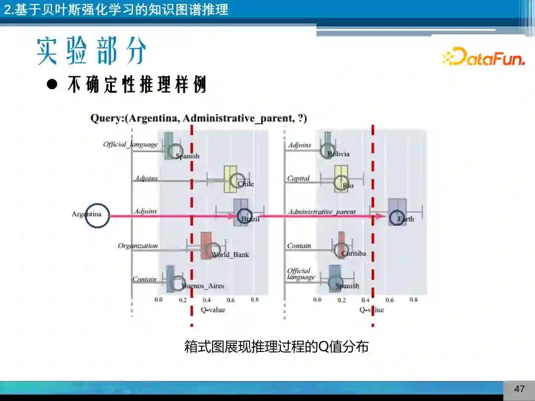 对推理的过程进行箱式图可视化,如图示例中,推理阿根廷是在哪里的?可以不确定性推理,实现 Q 值分布的不确定性,来实现不确定性推理。