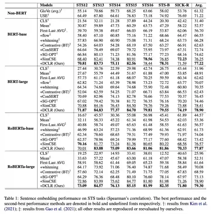 我们在 7 个数据集上进行了语义相似度测试,并与现有 baseline 进行比较。可以看到,DCLR 的性能在绝大部分实验中优于基线模型。