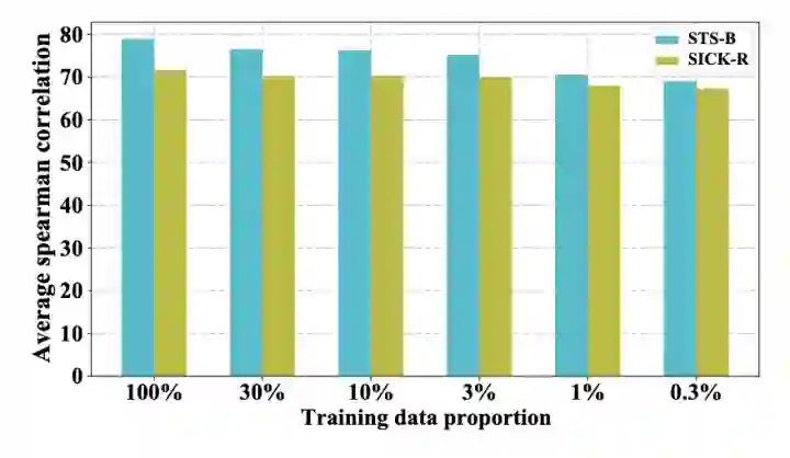 为了验证 DCLR 在少样本场景下的健壮性,我们在 0.3% 到 100% 的数据量设定下训练模型。结果表明,即使在相对极端的数据设定(0.3%)下,我们的模型性能也仅仅在两个任务中分别下降了了 9% 和 4%,这显示了模型在少样本场景中的有效性。