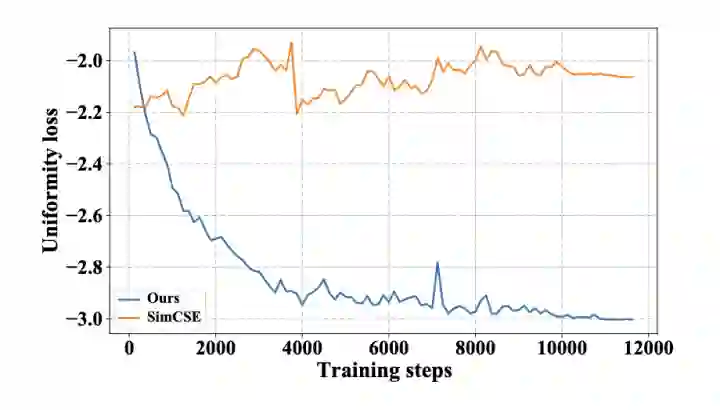均匀性是句表示的一个理想特征。我们比较了 DCLR 和 SimCSE 基于 BERT-base 在训练期间的均匀性损失曲线。遵循 SimCSE,均匀性损失函数为: