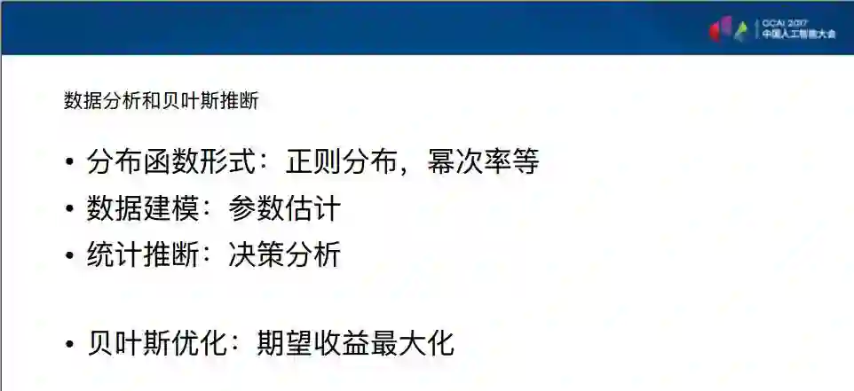 我们对这个问题的另外一个考虑是现在的数据科学。统计学通常包含两个部分,一个是学习,一个是统计推断。在学习的部分收集数据,收集数据后有一个方案是对数据进行建模。一种最简单的建模方式是均匀分布。另外一种经常用到的,特别是物理学、化学等自然科学用到的一种分布是高斯分布,还有经济学最常用的幂次率。对于这些不同的分布,我们逐步的知道它们越来越多的情况,可以说我们有一个知其然的过程,正态分布我们知道有大数定律在里面,所以我们也知道一些,但是对于幂次率我们并不是非常清楚地知道。
