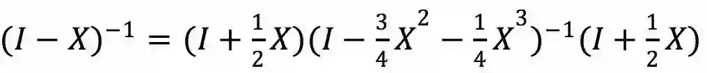 其中左右两个为线性的矩阵,中间为一个凸的线性组合。那个这个等式有什么用处呢?大家知道,牛顿算法是二阶收敛的,收敛非常迅速。中间的矩阵组合越来越接近I的,而且是以二阶的速度接近。那么为什么其他人不用牛顿算法算这些呢?因为用牛顿算法会让中间部分很快变得很稠密。数学家在用这个,实际没有人在用这个解问题。但我们在解电流过程中一直在做稀疏,当我看到这个问题时,我们能解决了,只需要把中间部分稀疏化就行。