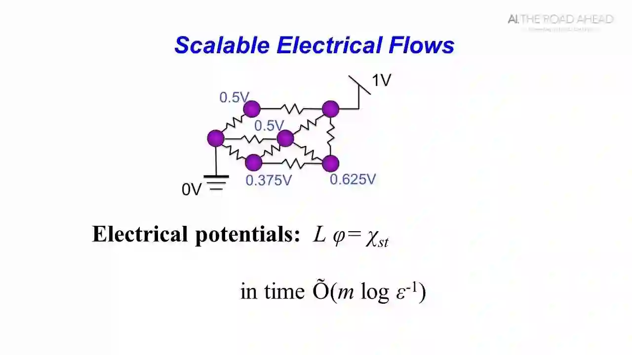 很多人问我为什么我会考虑这个问题。实际上很有趣,我们在中学的时候都学过解电流,只要给一个电路和两个点的电压差,我们很快都可以解出来。我们看自己的算法是线性的,只要解的时候和题目画出来的电路图是同一个数量级的,从头一节一节算下来就基本没有问题。但是进入新的时代,新问题中的电的网络并不定是并联和串联,而是随便连的。机器学习就有很多类似这样的问题。我个人很有兴趣,这么基本的一个问题,以前我们没有一个线性时间的算法。当时我们也不知道怎么回答它的意义,但是我们终于把这个基本的问题做出来了。但你很快能想到,这个和机器学习、图论的问题都有关系。