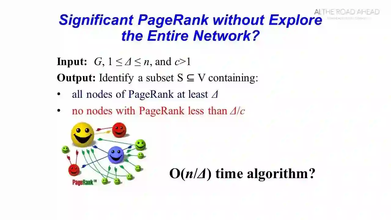 我们举个很简单的例子,就是Google在对网页的重要性排序,就叫PageRank。PageRank的实际意义就是,当用户停留在某一个网页上时,随机走到下一个相邻网页中,其中偶尔会回到全局中其他点,最后求用户停留在这些网页上的分布。在回答网页搜索查询时,Google会拿这个PageRank值作为指标,但Google在回答问题时并不需要计算所有的网页PageRank值,它只需要关注显著的PageRank。比如它有一个阈值Δ,把所有PageRank值大于Δ的网页输出,反之去掉。这件事情最简单的算法是,通过局部探索对网页PageRank值做计算,经过几轮之后就能得到最终的值。问题是能否在O(n/Δ)的时间内把它算出来。这个量太大了,有平方级别的规模,但计算时不需要都算出来,可以通过局部近似得到。局部近似可以用常数时间把一行的PageRank值近似出来。最后需要解的问题是一个很简单的问题。具体是,给定一个向量,它的每个元素都是0和1之间的,然后求这一行的和是否大于Δ或者小于Δ的一半。当你能把这个简单问题做出来之后,你就能求出显著的PageRank值。