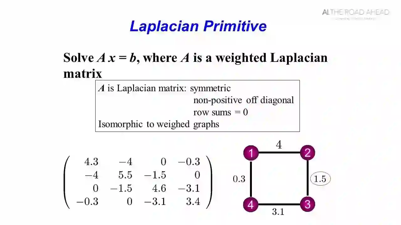 我以一个很简单的图论问题为例给大家介绍一下。这是一个简单的图论和数据计算交叉的问题,前人还没有能够解决掉。我们希望能够解一个线性方程,你给一个矩阵和一个向量,要解一组方程Ax=b。但是我们主要考虑其中有一类矩阵叫拉普拉斯矩阵,矩阵中的一个值对应图中一条边的权重的相反数,而矩阵对角线上的值为该点的边权之和。这类矩阵在很多问题中都被用到。这个问题看起来很简单,但是实际上多年来大家都没有找到接近线性的算法。十年前,我们用一系列的图论方法证明,这类问题基本上可以在线性时间里全部解出来。这个结果出来以后,又经过了八年研究,很快这个结果就变成线性的算法了。以前很复杂的算法,后来很多人一直对它进行更新,现在已经基本成为和排序一样快的一个算法。