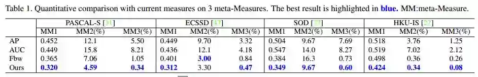为了公平的比较,指标首先在公开的一个前景图检测数据集ASD[3]上对4个元度量进行评测。评测结果显示我们的结果取得了最佳性能: